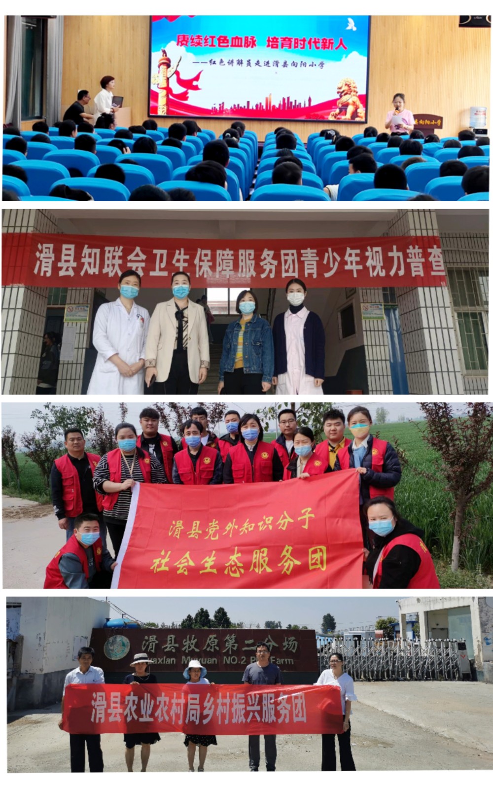 目前,各服务团已完成服务项目16个。其中,教育文化服务团赴老店镇卢外村开展公益服务送基层活动,助推乡村振兴,组织开展了2022年“中国旅游日”主题月暨“云游滑州”活动、“端午寄情·国乐和雅”2022年滑县端午节活动、“高铁新时代·市民文化节”直播活动、红色讲解员进校园活动。社会生态服务团深入大寨乡丁家村持续开展人居环境整治帮扶工作,通过现场调查、研究分析,分别撰写《怎样常态规范治理电动三轮四轮建议》《解决住宅小区停车难的建议》,为县委县政府科学决策建言献策,同时,发挥专业技术优势,通过召开座谈会、现场指导等方式,助力大寨乡丁家村创建市级生态村。卫生保障服务团深入校园对中学生进行视力筛查,并向学生及家长普及眼健康知识,开展慢性病宣传、咨询服务,赴乡镇开展健康义诊、生殖健康保健知识讲座、分级诊疗帮扶等活动。乡村振兴服务团3次深入基层开展布病防控技术知识宣传和培训、动物疫病净化技术指导和抽样检测,并开展了突发非洲猪瘟疫情防控应急演练,提高动物防疫队伍防控实战能力。