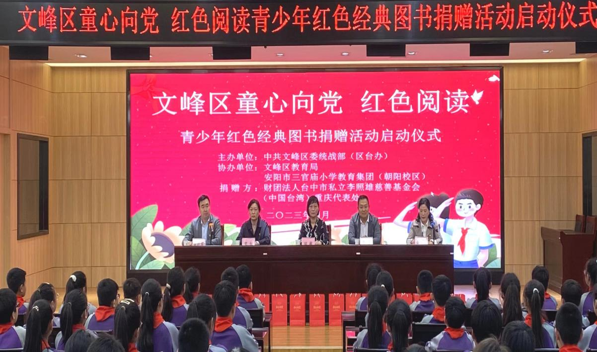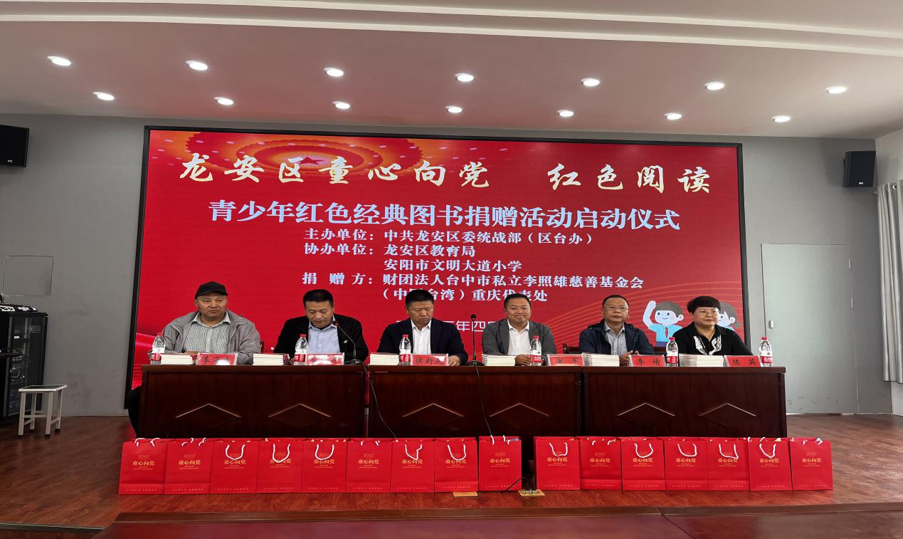 4月中旬,台中市李照雄慈善基金会(中国台湾)“童心向党、红色阅读”图书捐赠仪式在安阳市文峰区、龙安区举行。基金会代表唐军,龙安区委常委、统战部部长侯新庆,文峰区委统战部副部长、台办主任田敏、区教育局相关领导出席了捐赠仪式。